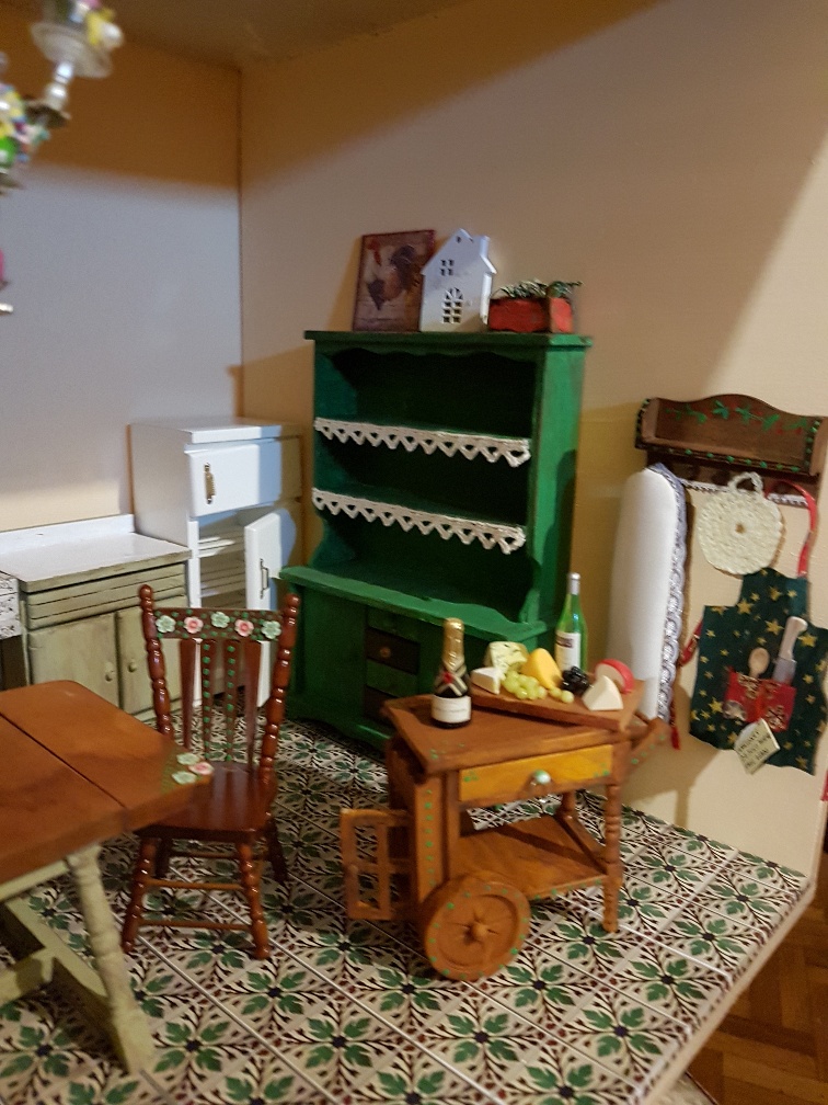 With the little fimo flowers I decorated a tea set, one of those that come from China. I bought this one because I loved the matching colours . It is a bit big for the scale, but I like it enough to ignore it. In fact all the tea sets I have are a bit big, I do not know why, I guess the exact 1:12 are expensive.